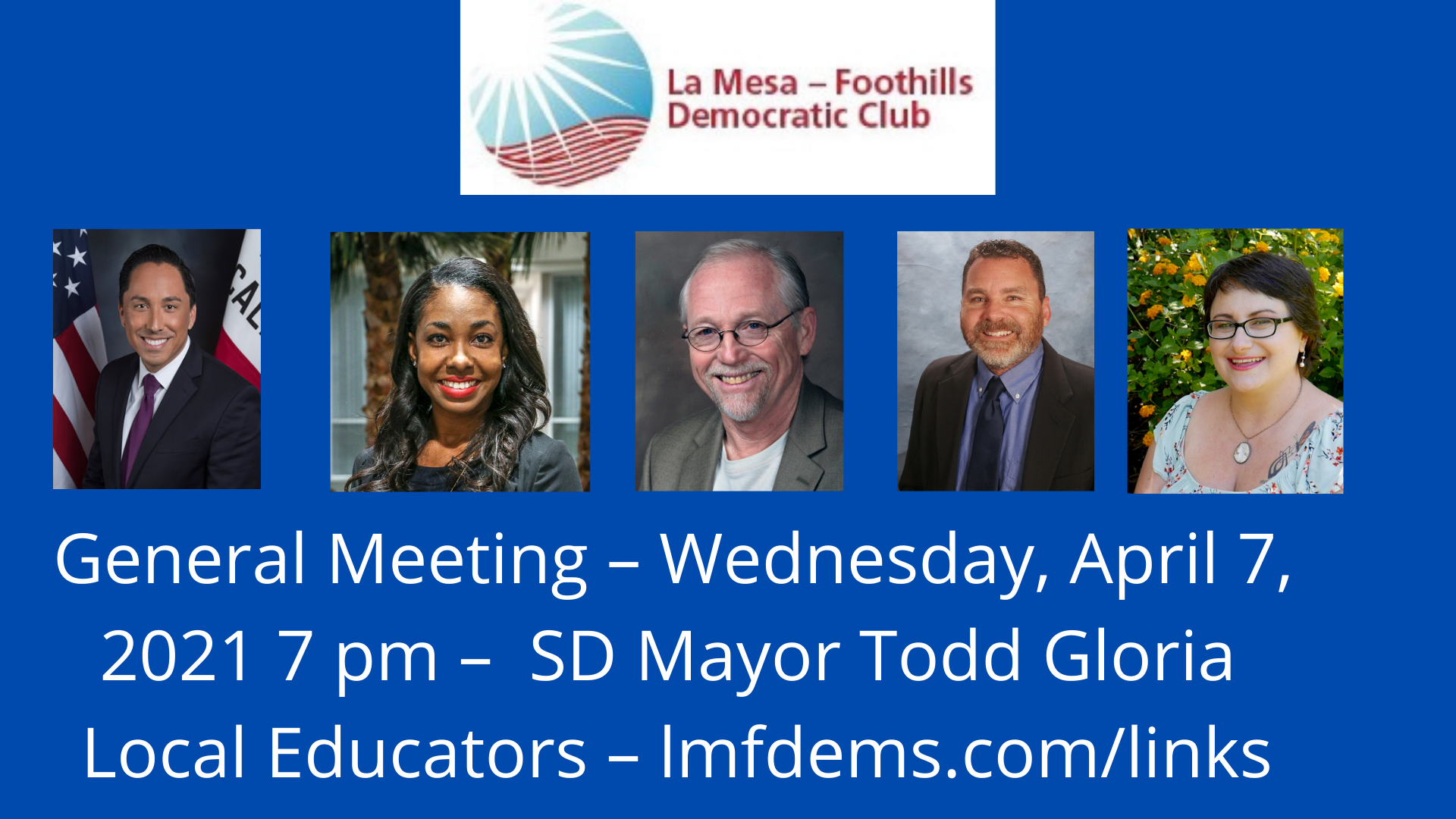 We’ve got another fantastic meeting in store for you Wednesday, April 7, 7 pm. We’ll kick things off with San Diego Mayor Todd Gloria; he’ll talk with us about the big issues facing the city, including reopening, homelessness, housing and more.