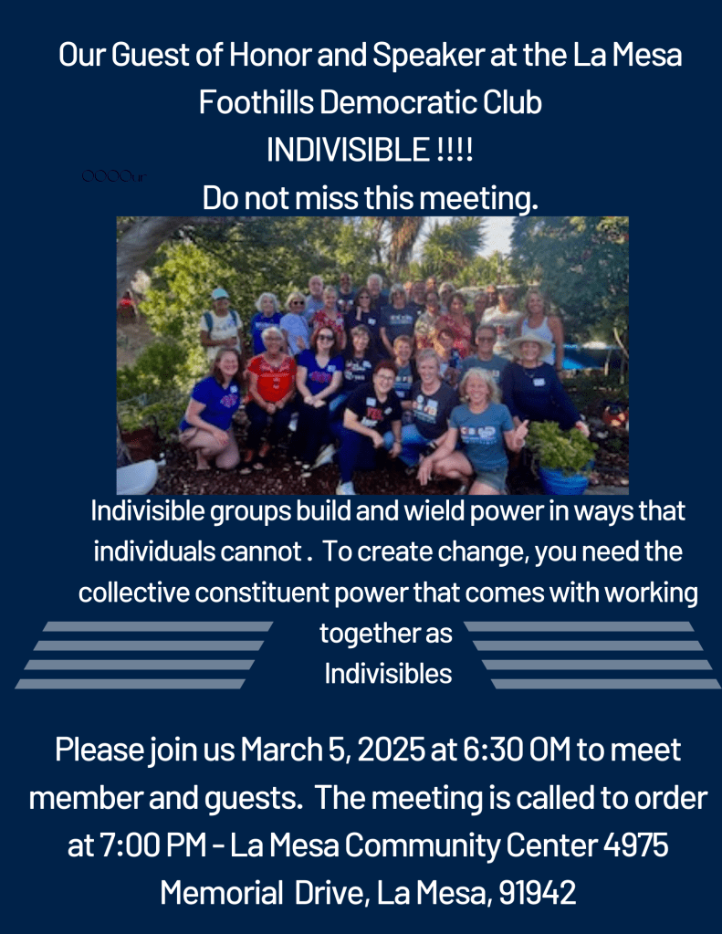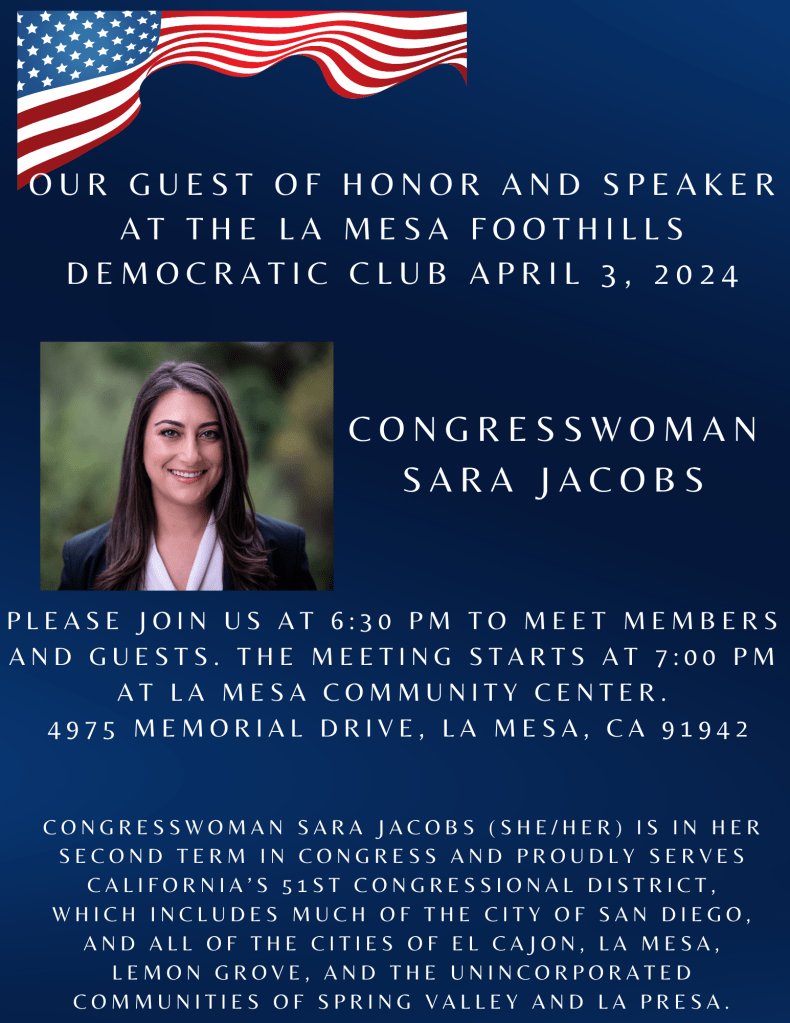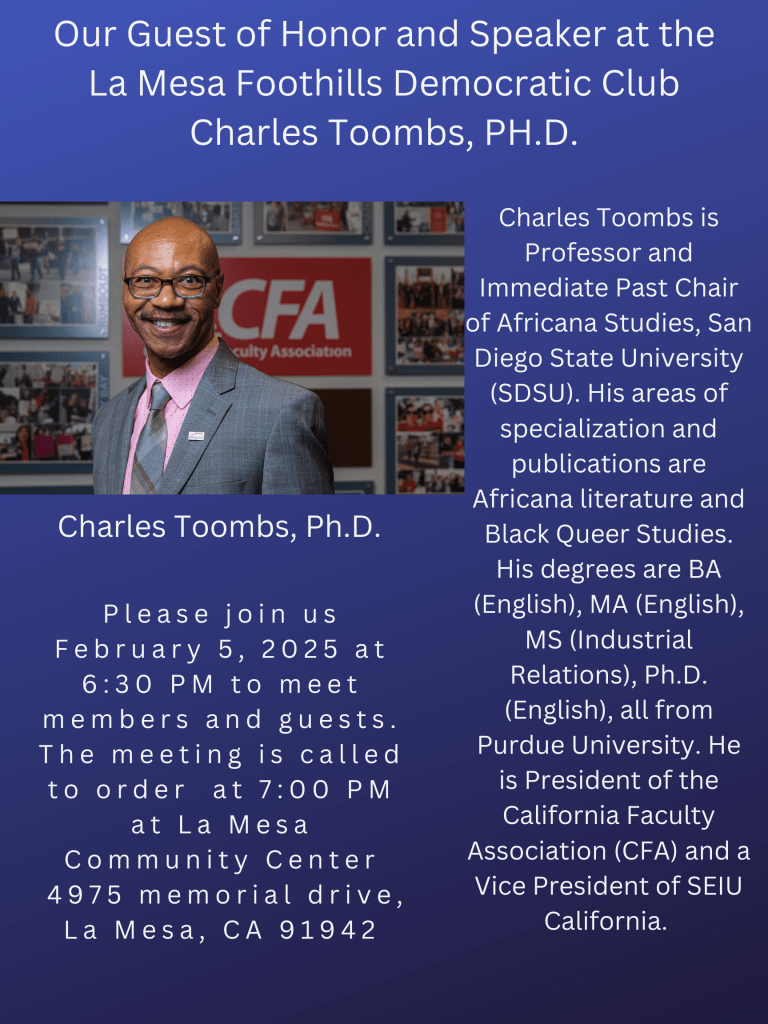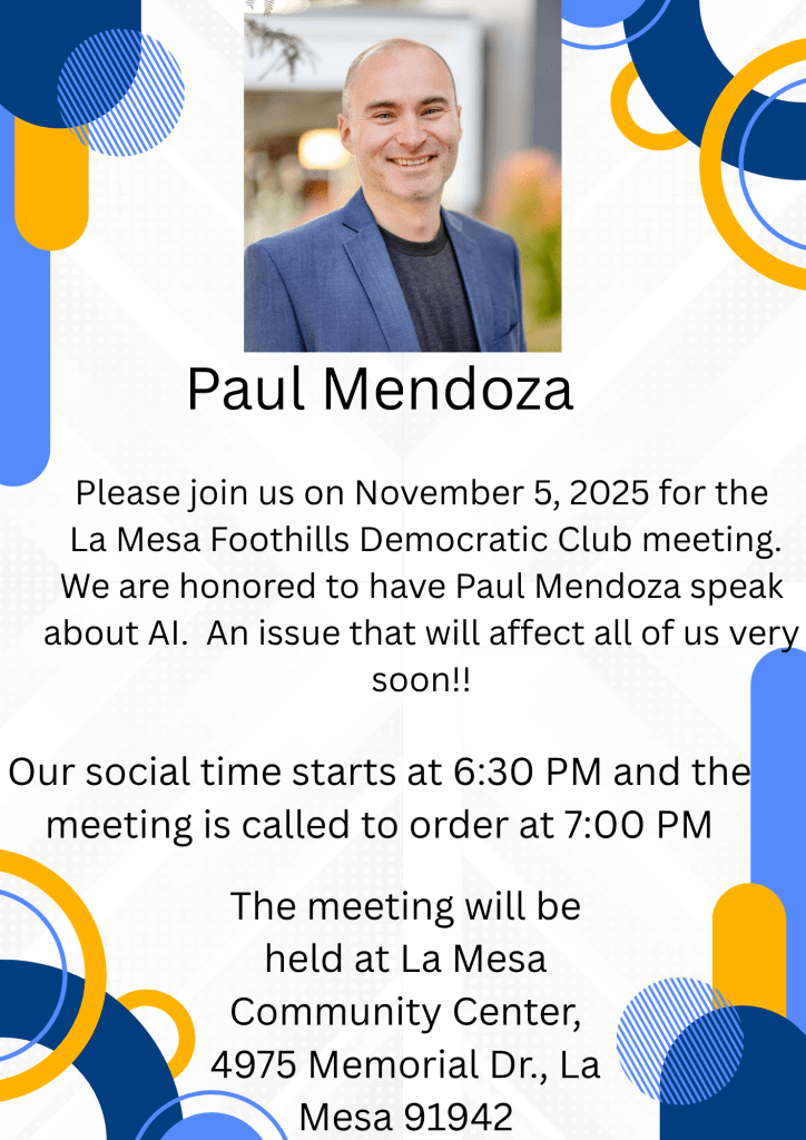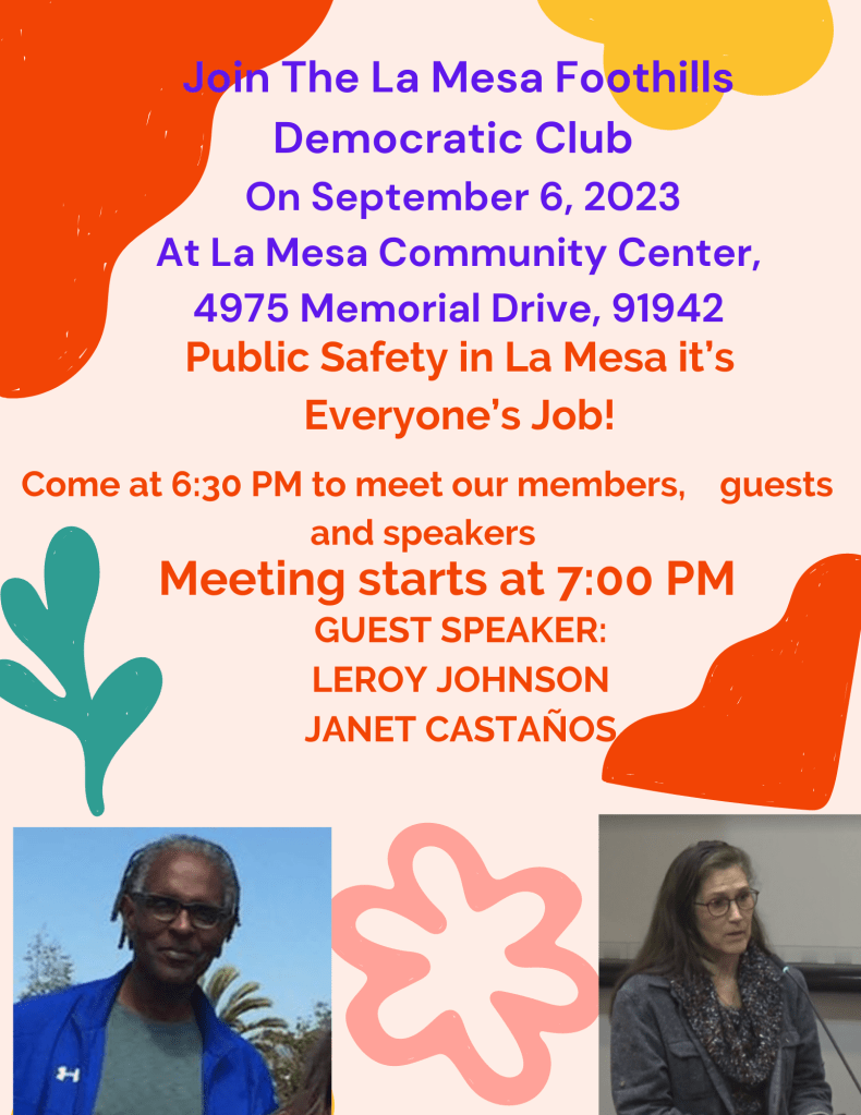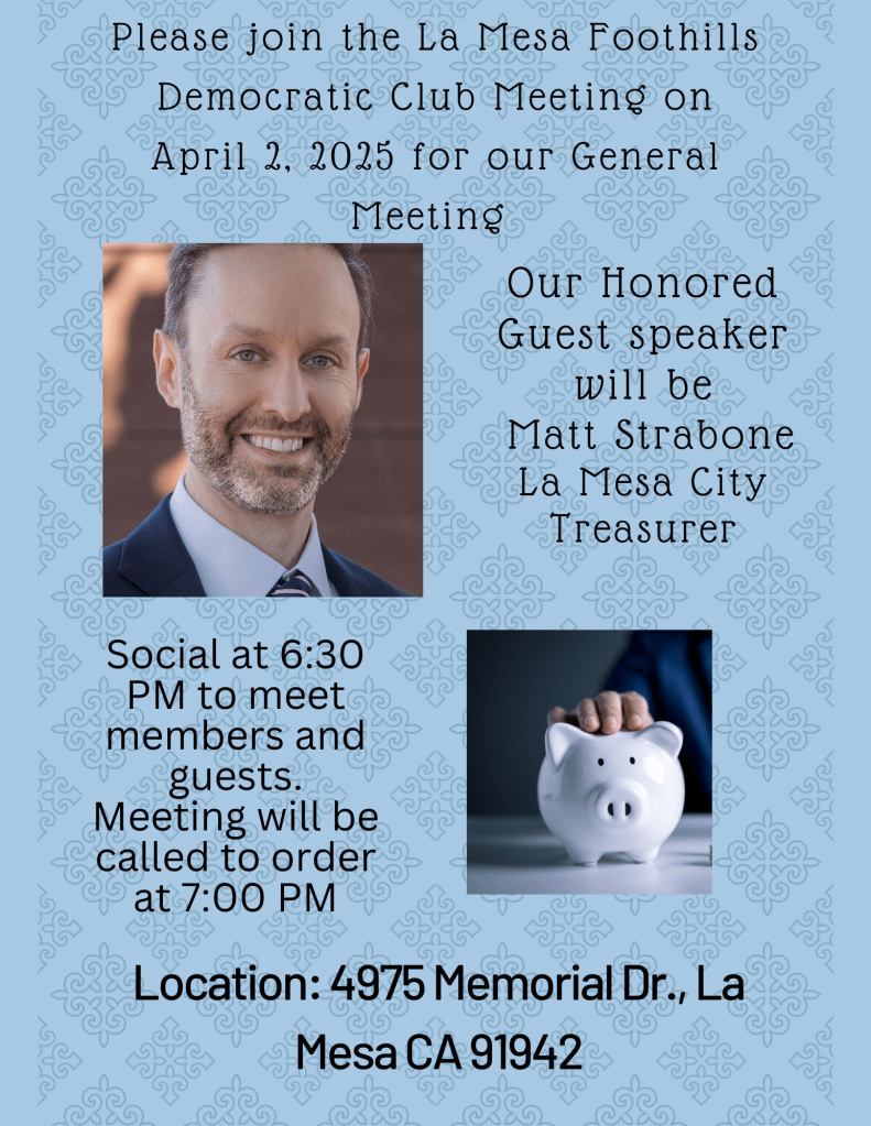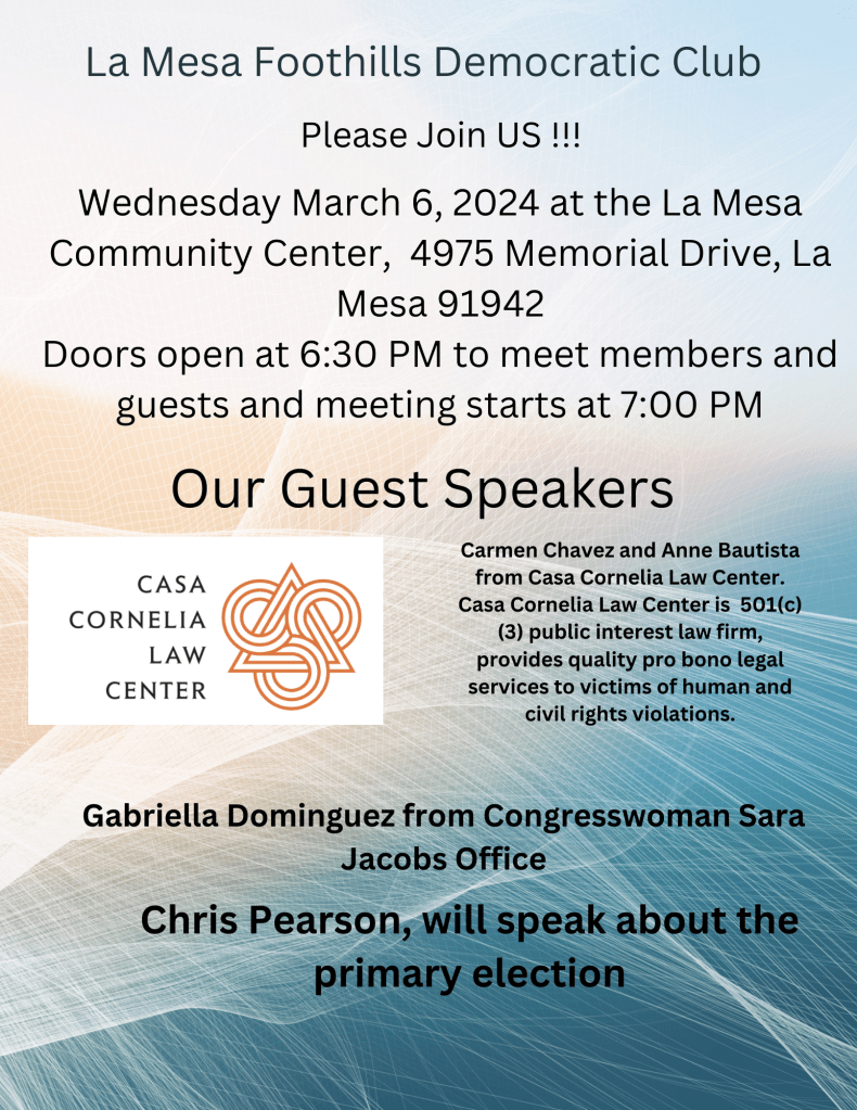 The meeting starts at 7 pm–but do come early, at 6:30 pm, for the usual casual conversation with fellow Democrats. As usual, the meeting is at the La Mesa Community Center, 4975 Memorial Drive.
