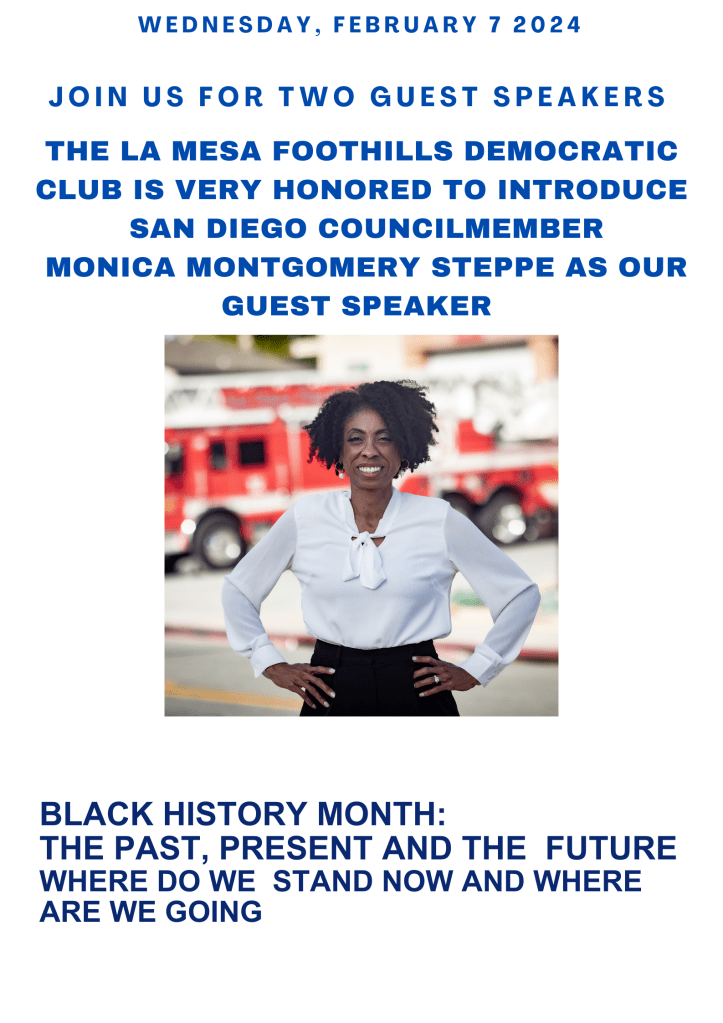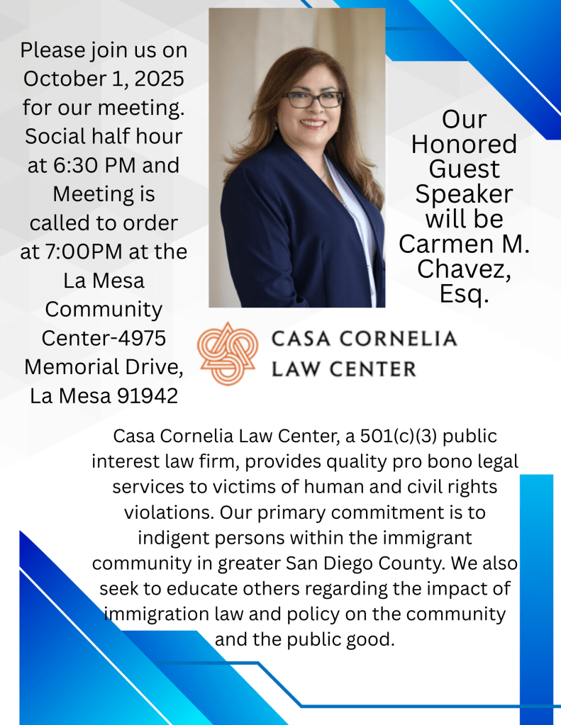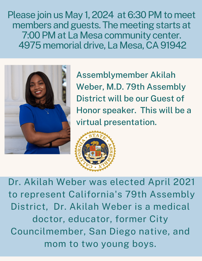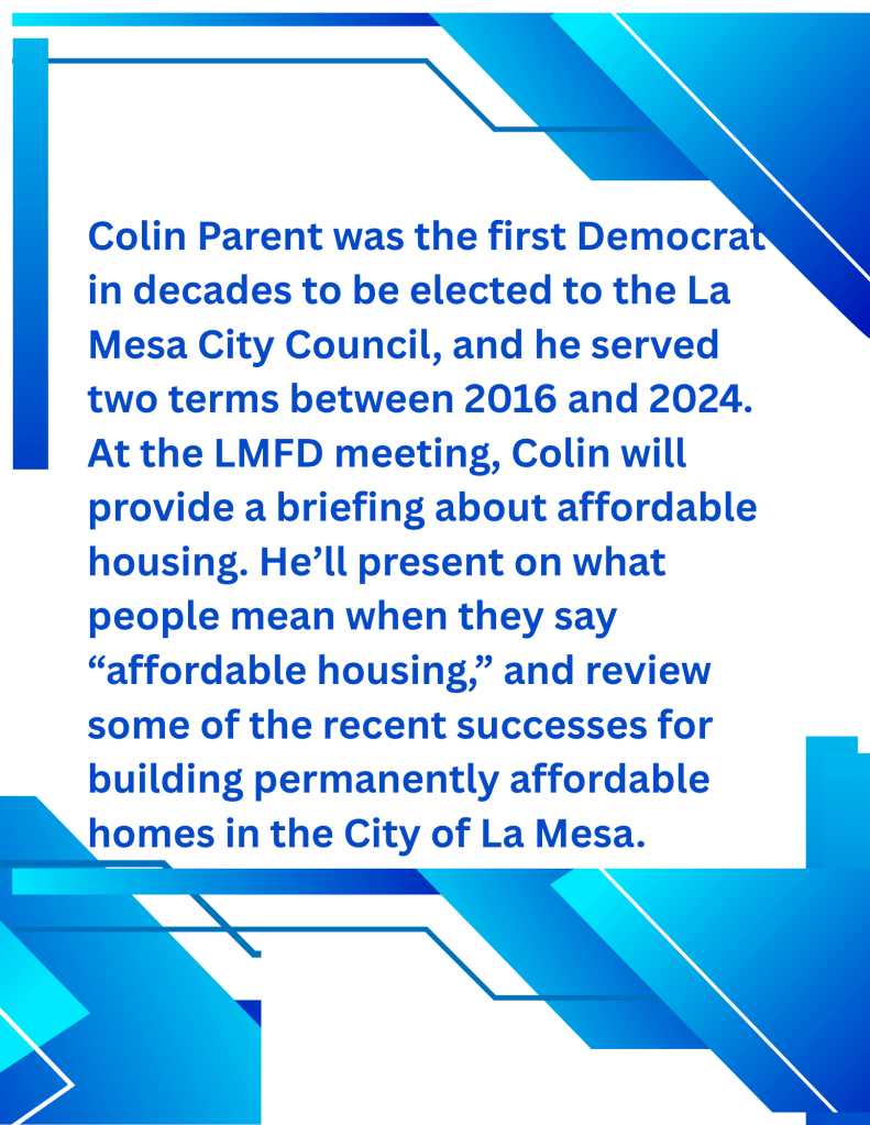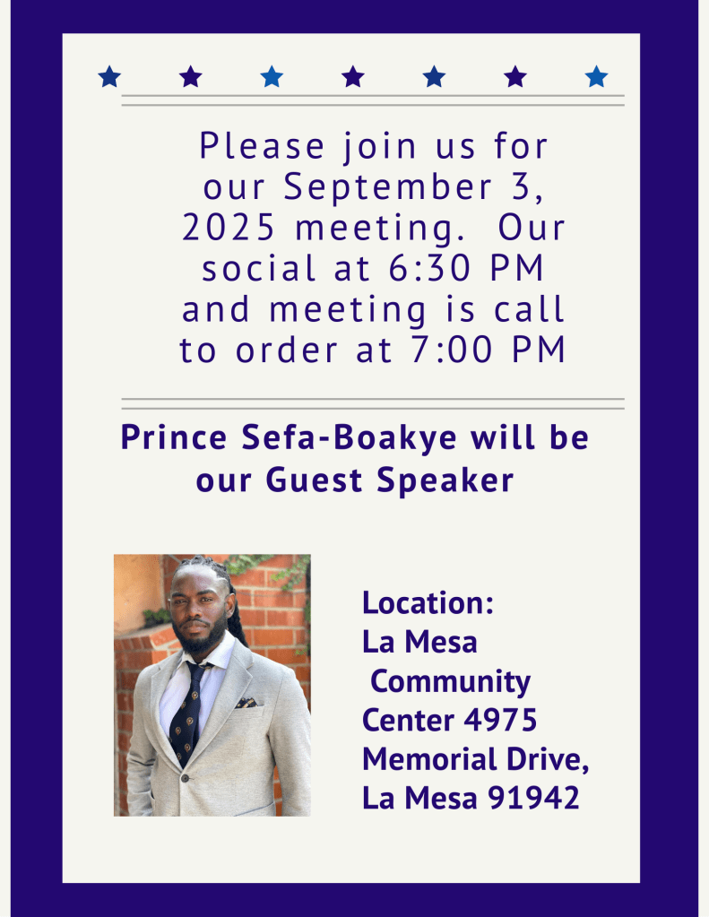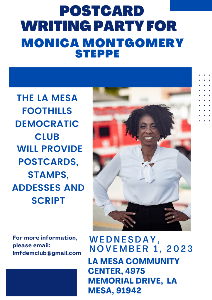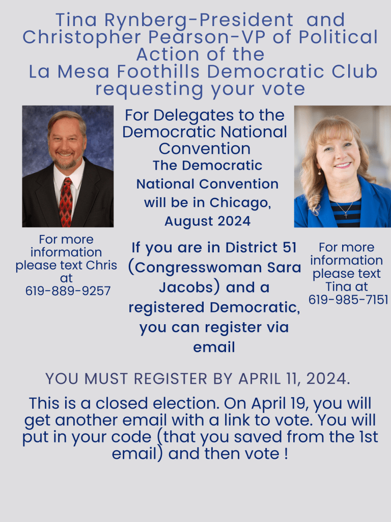 The meeting starts at 7 pm–but do come early, at 6:30 pm, for the usual casual conversation with fellow Democrats. As usual, the meeting is at the La Mesa Community Center, 4975 Memorial Drive.