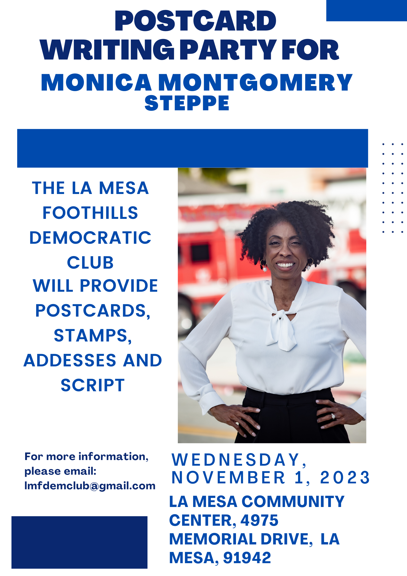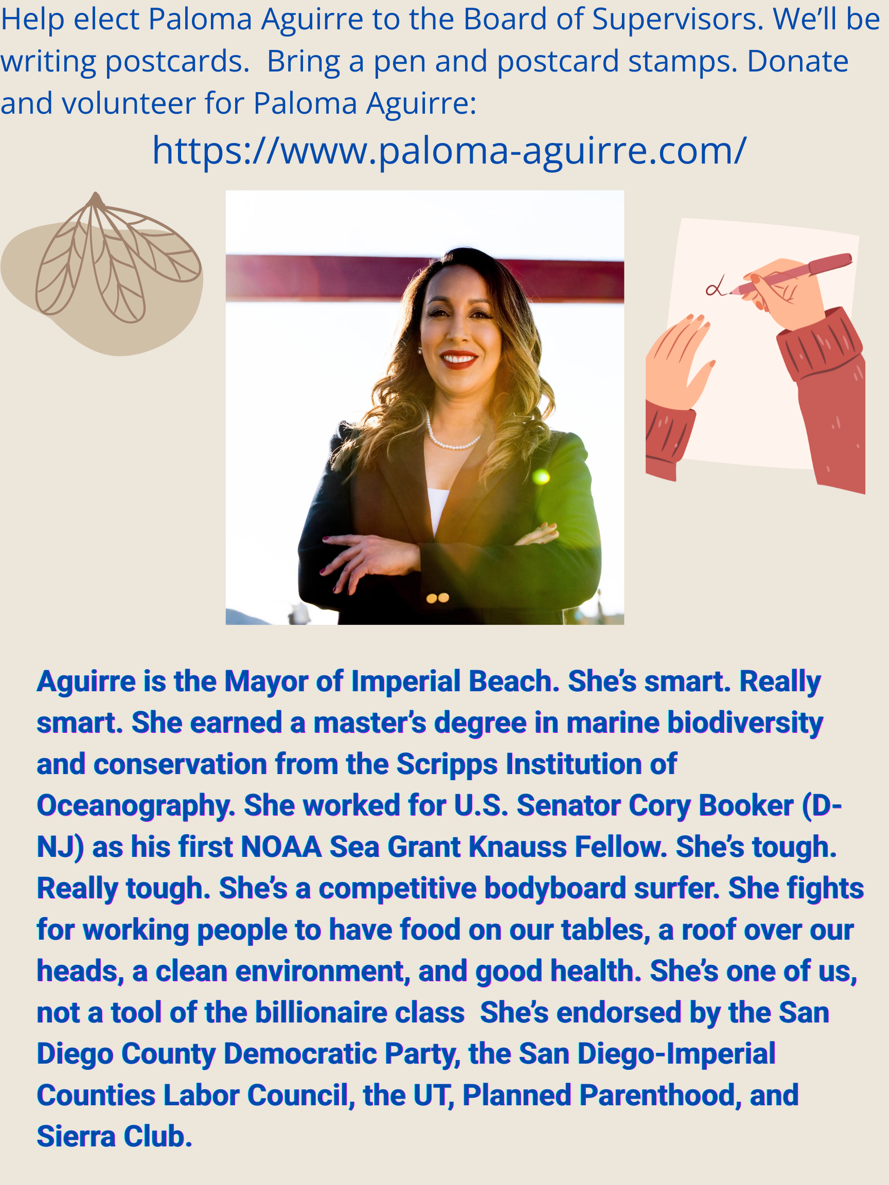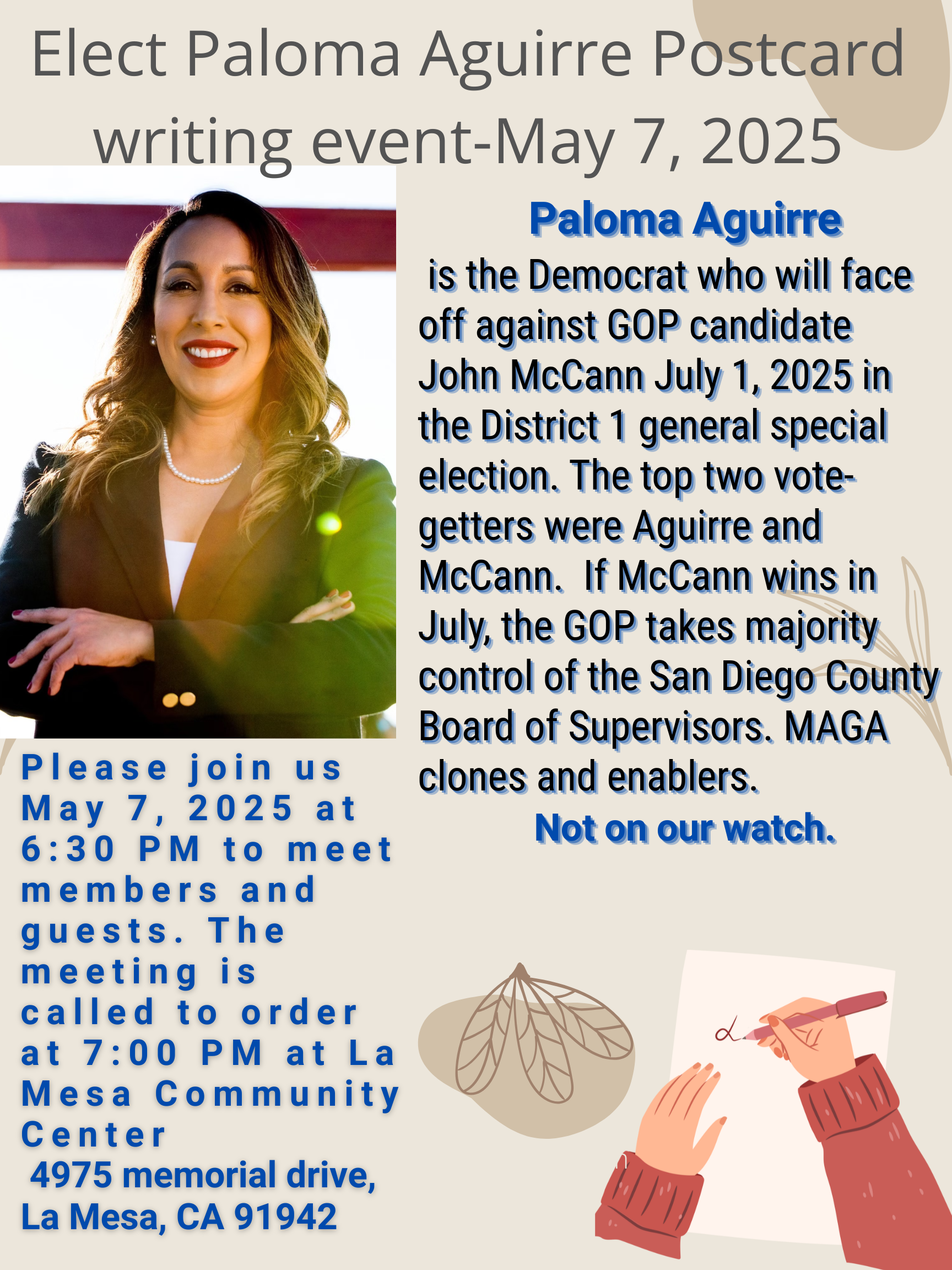 - Mejgan Afshan and Patricia Dillard for La Mesa City Council. Kathleen Brand announced she’s dropping out of that race, leaving two Democrats running in contested elections for two open seats, and clearing a path for victory. We thank Brand for her sacrifice.