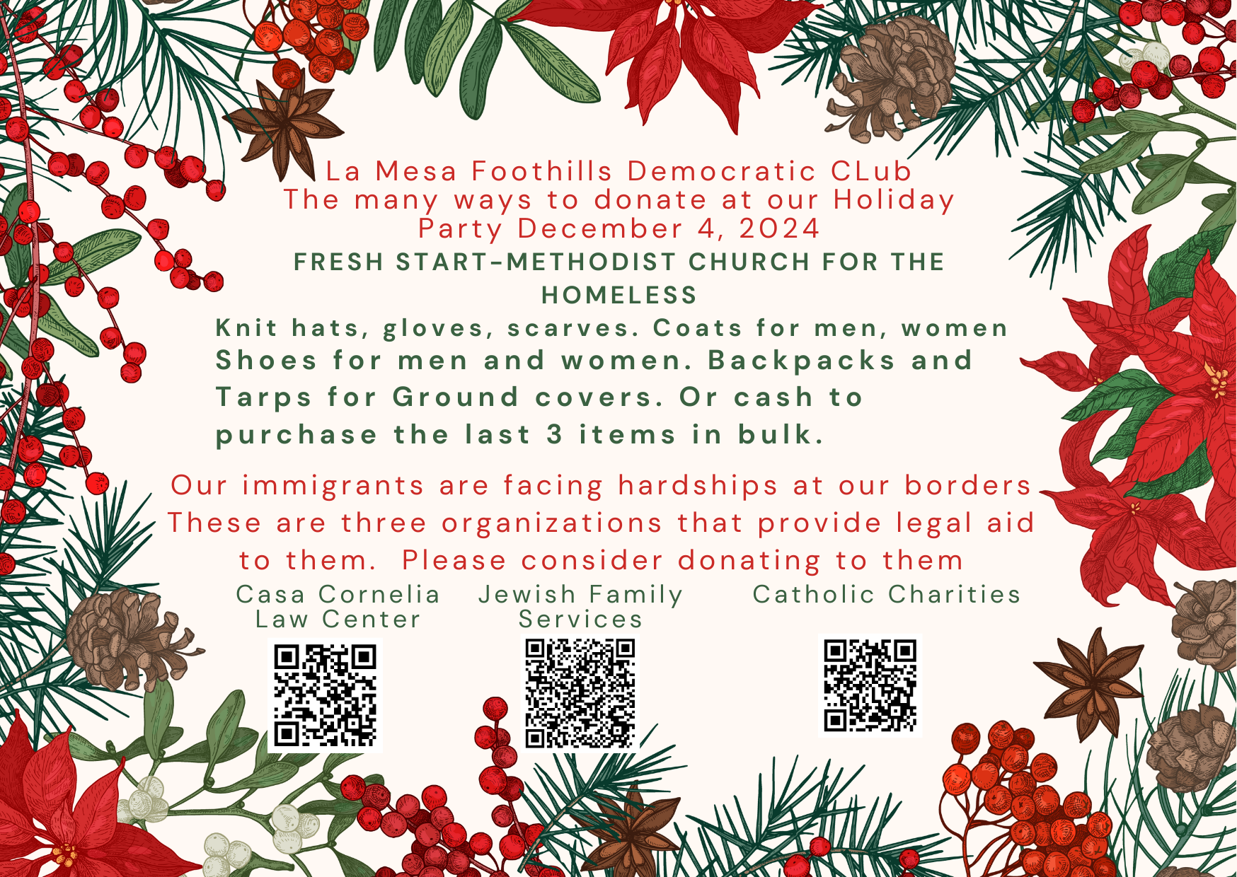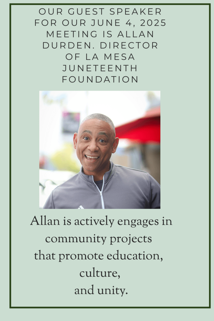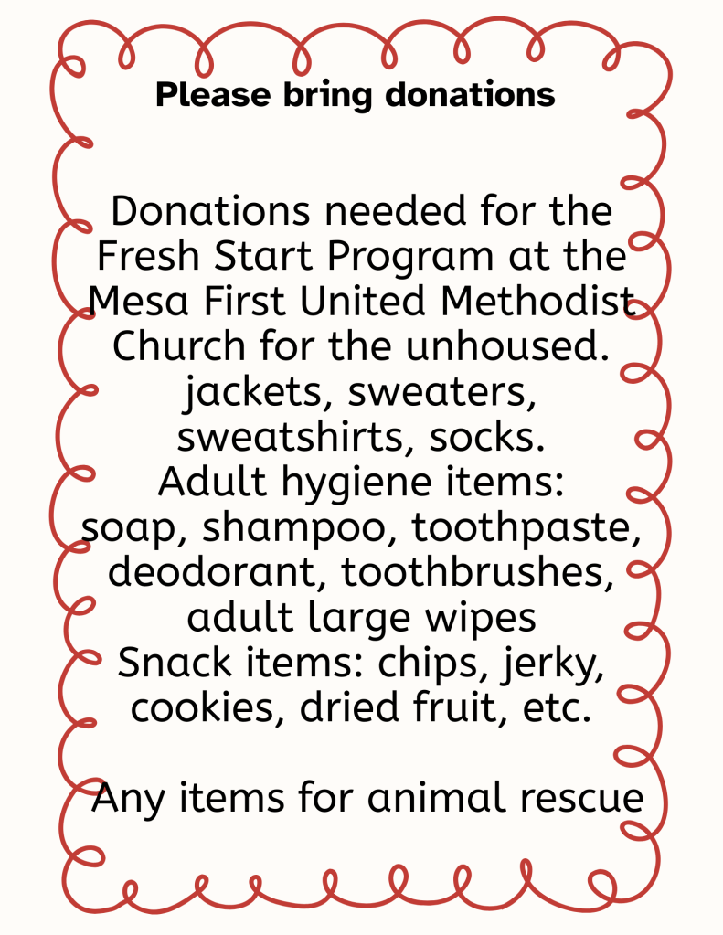 Our holiday theme is “MAKE IT A WARM SEASON FOR ALL”, so we are asking for donations of new/gently used warm coats, jackets, sweaters, sneakers, boots for the La Mesa Methodist Church to distribute to those in need of assistance. There is a real need for men’s items. We will happily accept food donations for the church as well.