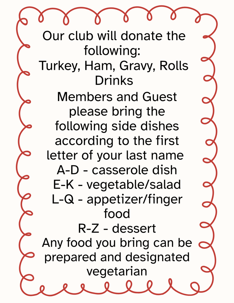 We’re asking members to contribute side items for dinner, things such as side dishes, salads, small entrees, and desserts. The LMFDC Board is providing turkey and ham along with the usual foods provided for meetings. Last names A-H please bring a side dish; I-P please bring salad or small entrees; Q-Z please contribute a dessert.
