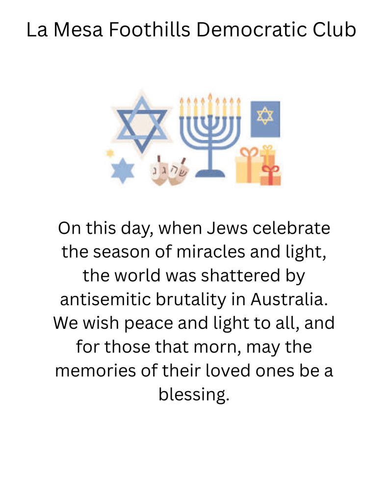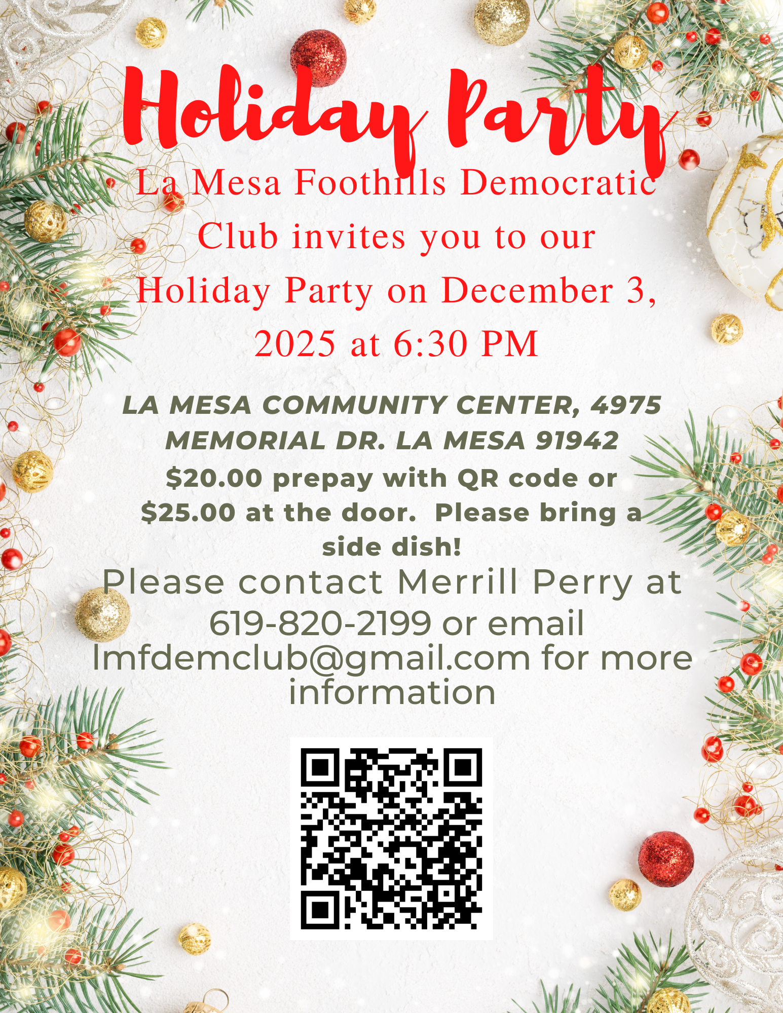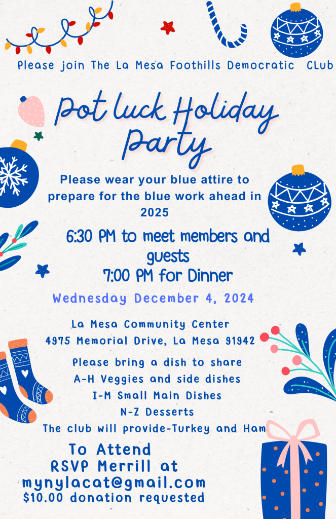 The La Mesa Foothills Democratic Club cordially invites you, your friends, and family to our annual Holiday Party on Wednesday, December 7th, 6:30 PM at the La Mesa Community Center, 4975 Memorial Drive, to celebrate the holidays and a very good year for local Democrats. You will enjoy delicious food, drinks, music by the Joseph Luna Band, and great conversations with fellow Democrats and friends—all for the low price of $10. Be sure to come and kick up your heels!!