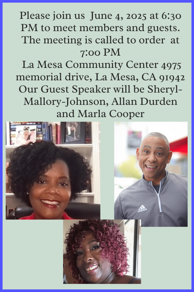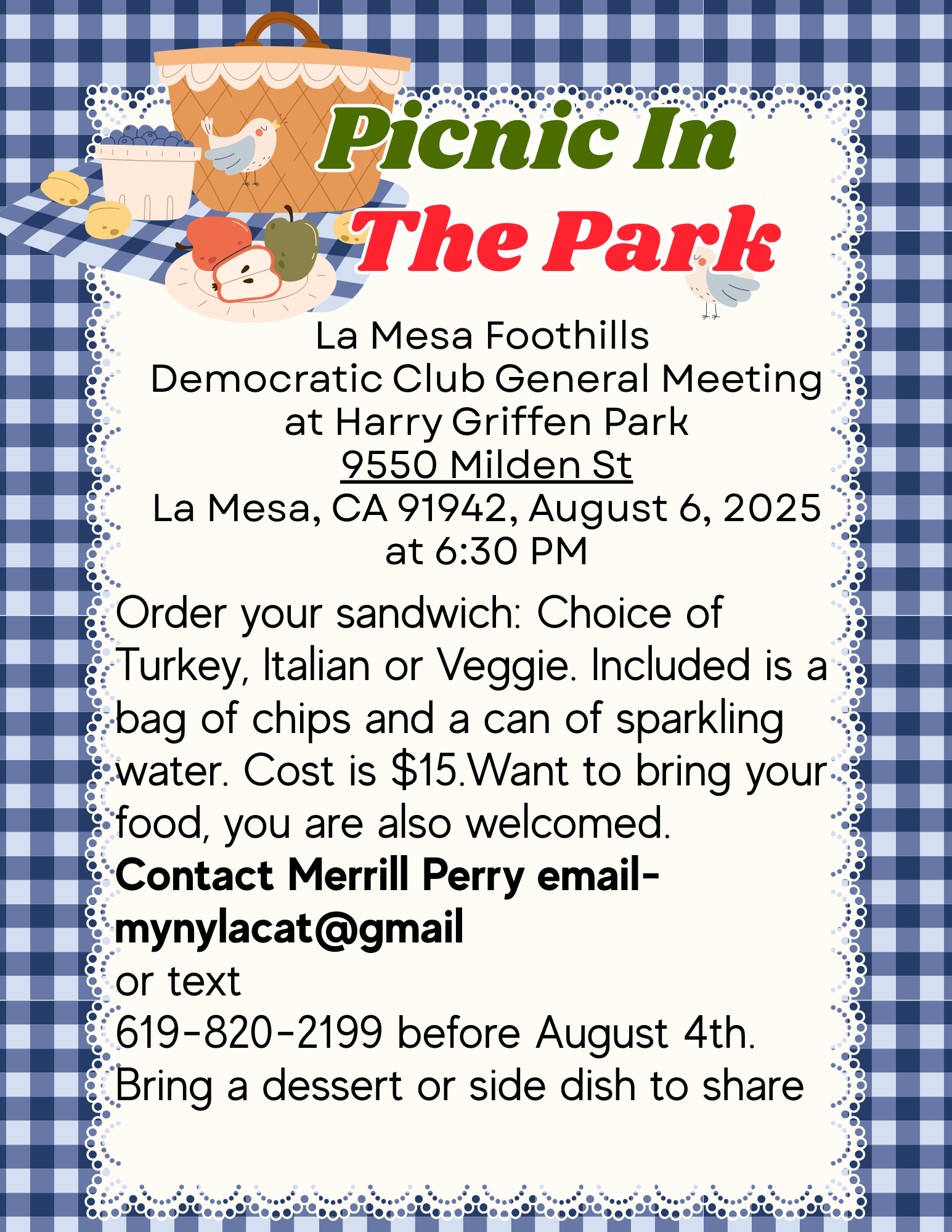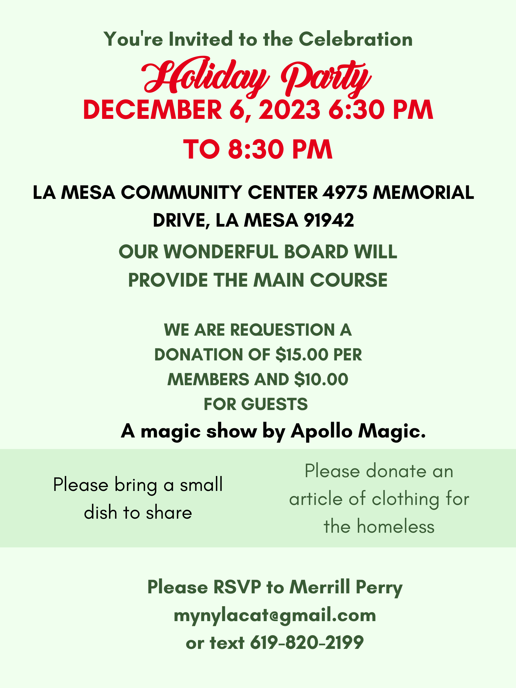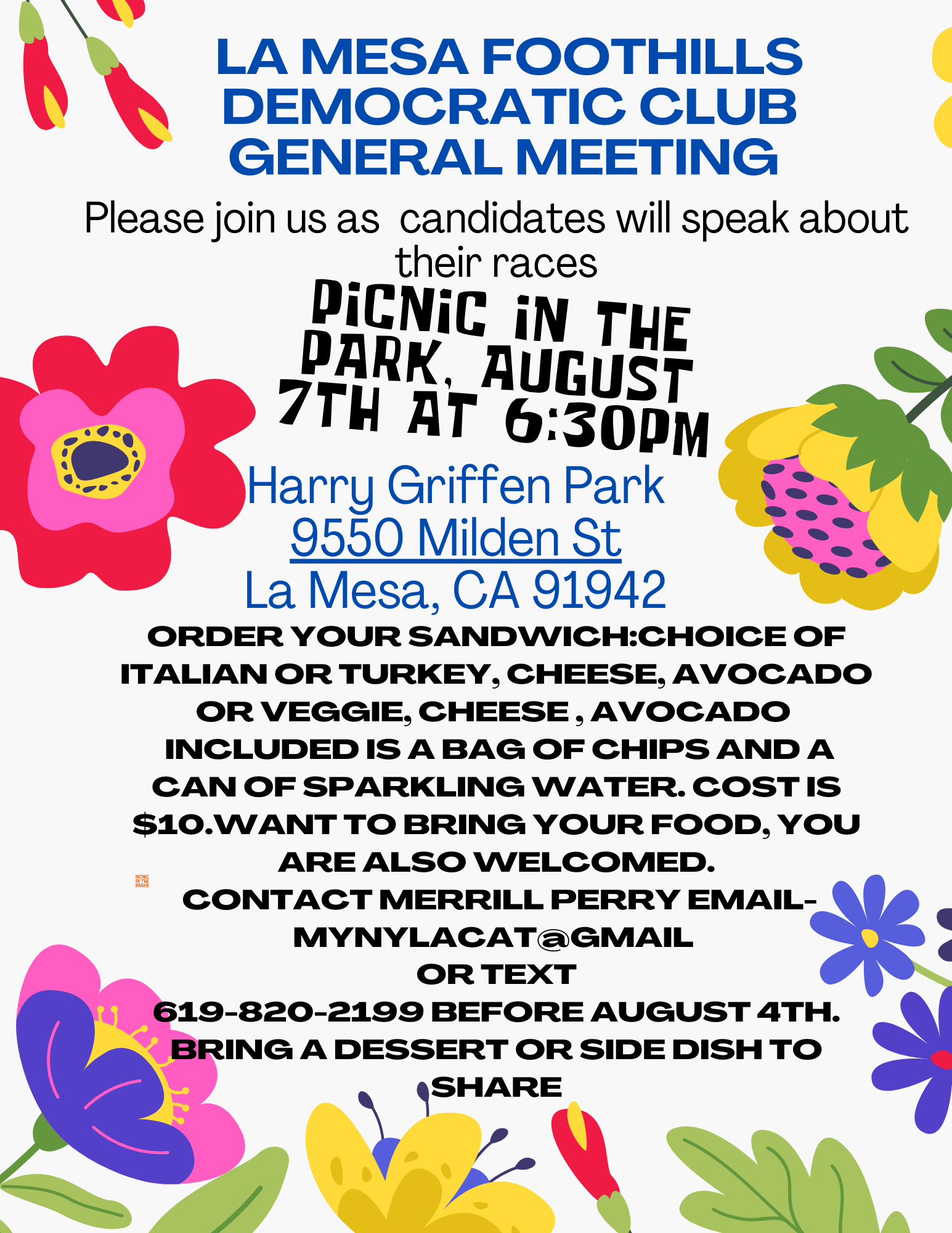 Please RSVP to Merrill Perry at (619) 820-2199 or mynylacat@gmail.com. We need a head count! And contact Merrill directly with questions or concerns.