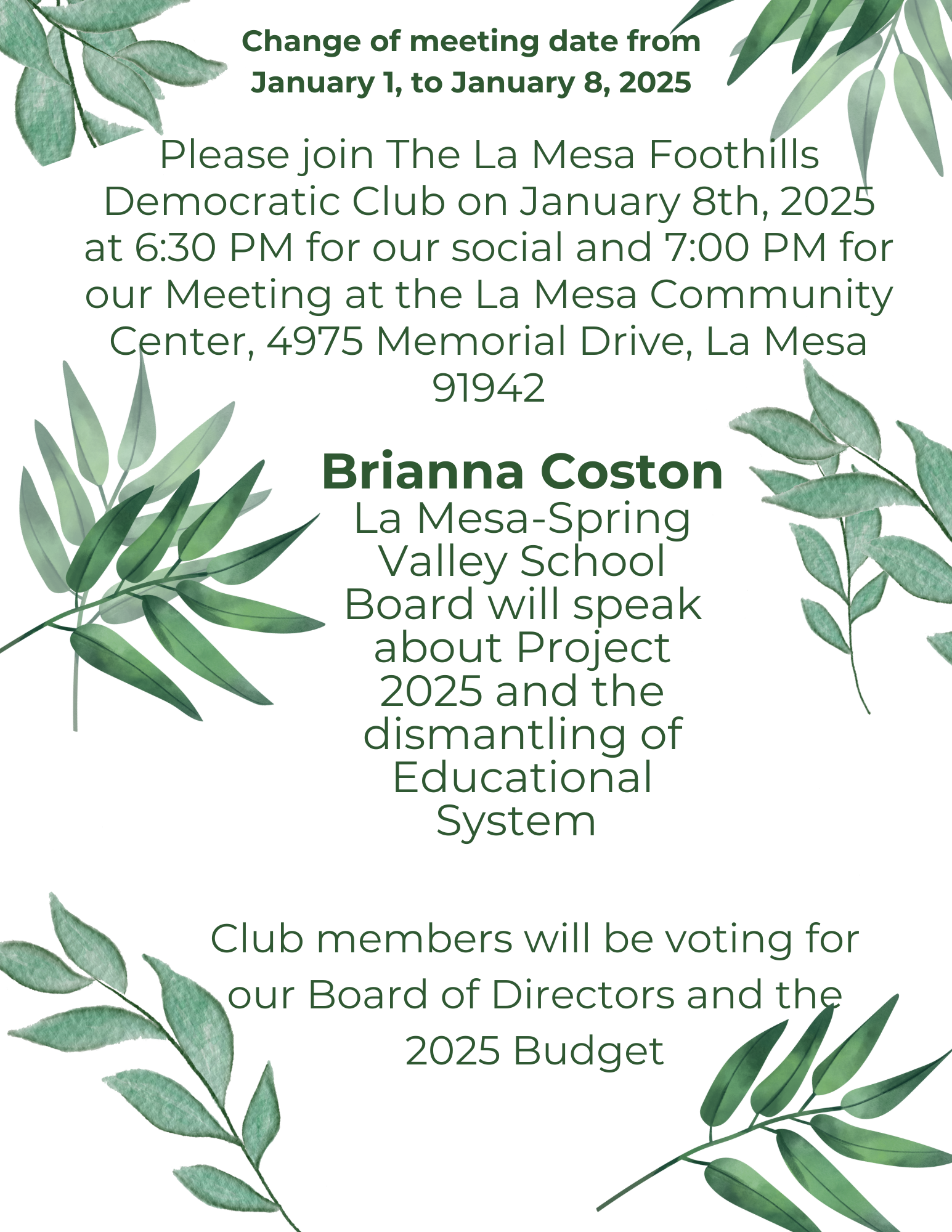 Meeting of The La Mesa Foothills Democratic Club