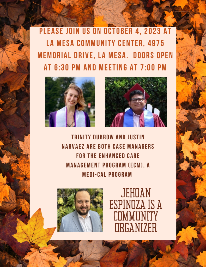 We’ll be doing GO Team training at our October meeting. We’ll also hear from more candidates, from across East County.